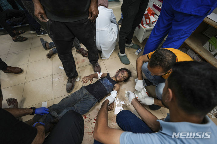 [가자지구=AP/뉴시스] 이스라엘의 가자지구 폭격으로 부상한 팔레스타인인들이 21일(현지시각) 가자지구 데이르 알발라에 있는 알아크사 병원 바닥에서 치료받고 있다. 2024.05.22.