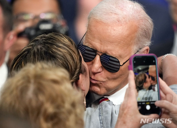 [내슈아=AP/뉴시스] 조 바이든 미국 대통령이 21일(현지시각) 뉴햄프셔주 내슈아의 YMCA에서 참전용사들의 건강 혜택 확대를 위한 PACT 법에 대한 연설을 마치고 한 지지자 볼에 입 맞추고 있다. 2024.05.22.