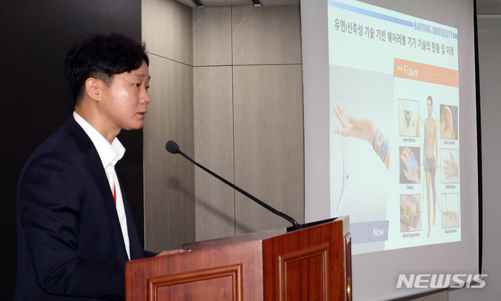 [세종=뉴시스] 강종민 기자 = 정예환 한양대학교 융합전자공학부 교수가 지난 22일 세종시 정부세종청사에서 네이처지에 발표될 '변형 불변 신축성 무선주파수 전자기기'(Strain-Invariant Stretchable Radio-Frequency Electronics)의 내용을 설명하고 있다. 2024.05.23. [email protected]