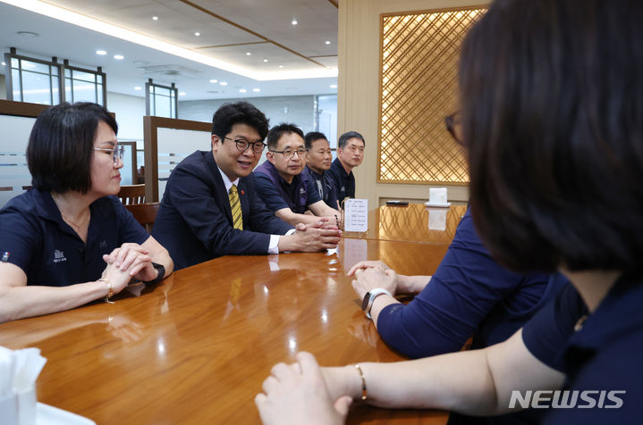 [서울=뉴시스] 고승민 기자 = 김준우 정의당 대표, 권영국 민주사회를위한 변호사모임 변호사가 22일 서울 여의도 국회에서 국회 청소노동자들과 오찬에 앞서 대화를 나누고 있다. 2024.05.22. [email protected]
