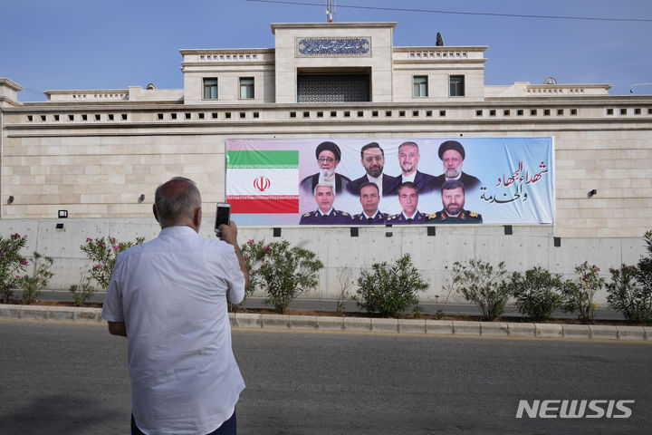 [베이루트=AP/뉴시스] 22일(현지시각) 레바논 베이루트 주재 이란 대사관 벽에 헬기 추락사고로 숨진 에브라힘 라이시 이란 대통령과 다른 희생자들의 사진이 담긴 현수막이 걸려 있다. 2024.05.23.