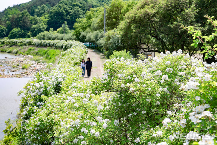 [산청=뉴시스]= 23일 산청군 차황면 금포림 둑길에 찔레꽃이 만개해 발걸음마다 은은한 향을 선사하고 있다. 25일 장사익 찔레꽃 음악회가 열린다.(사진=산청군 제공). 2024.05.23. [email protected] *재판매 및 DB 금지