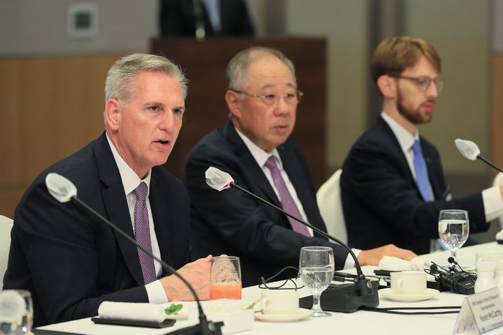 [서울=뉴시스] 이영환 기자 = 케빈 매카시 전 미국 하원의장이 23일 서울 영등포구 FKI타워 컨퍼런스센터에서 열린 초청 간담회에서 기조강연을 하고 있다. (사진=한국경제인협회 제공) 2024.05.23. [email protected] *재판매 및 DB 금지