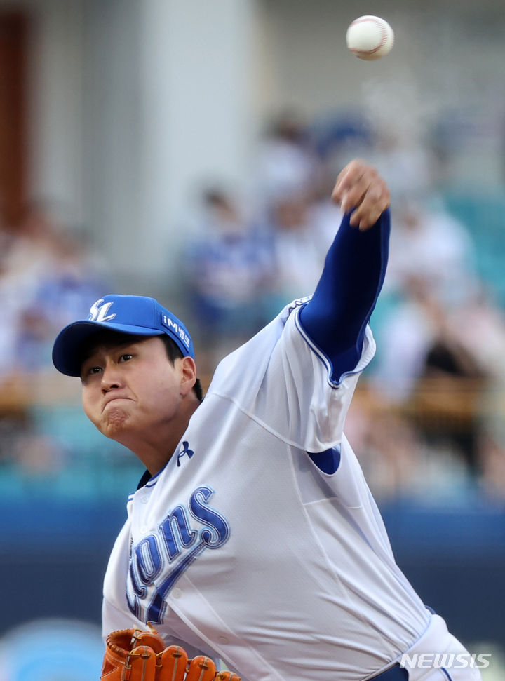 [대구=뉴시스] 이무열 기자 = 23일 대구 수성구 삼성라이온즈파크에서 열린 2024 신한 SOL 뱅크 KBO리그 KT 위즈와 삼성 라이온즈의 경기, 1회초 삼성 선발투수 이승현이 역투하고 있다. 2024.05.23.  [email protected]