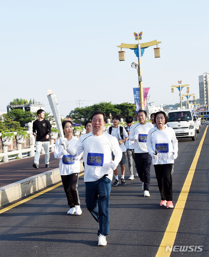 [밀양=뉴시스] 안지율 기자 = '영남루의 꿈, 밀양아리랑의 빛'이라는 주제로 경남 밀양시 밀양강 둔치에서 열리는 제66회 밀양아리랑대축제 첫날인 23일 오후 국보 영남루 입구에서 밀양의 3대 정신 중 지덕정신의 불씨가 국보 영남루로 들어오고 있다. 2024.05.23. [email protected]
