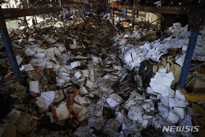 [하르키우=AP/뉴시스] 우크라이나 하르키우에서 러시아의 미사일 공격으로 폐허가 우크라이나 최대의 인쇄소 작업장에 24일(현지시각) 불에 탄 책들이 잔해로 쌓여 있다. 전날 발생한 이 공습으로 민간인 7명이 숨졌다. 2024.05.25.