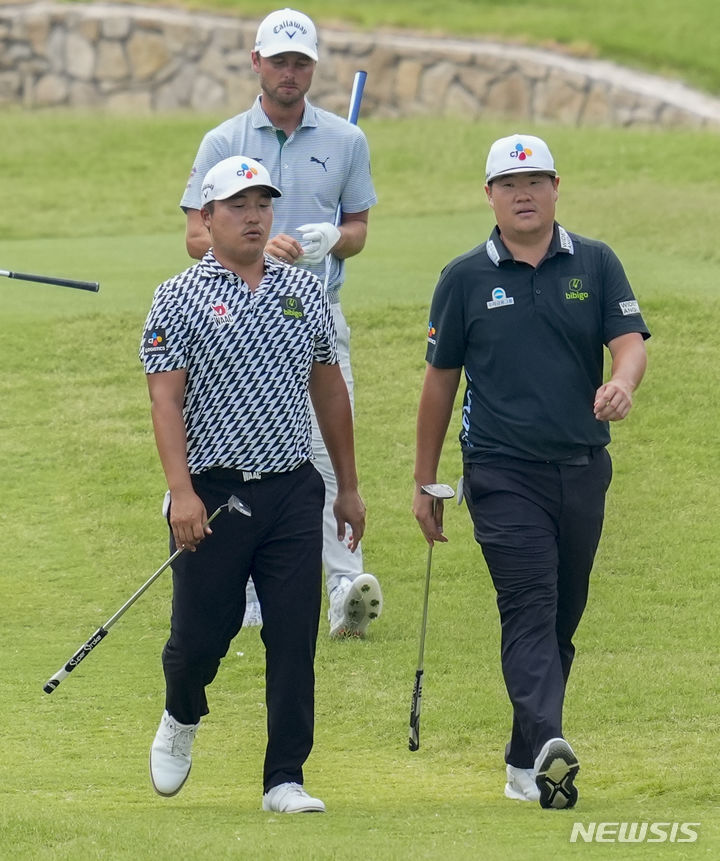 [포트워스=AP/뉴시스] 임성재(오른쪽)와 이경훈이 24일(현지시각) 미 텍사스주 포트워스의 콜로니얼 CC에서 열린 미국프로골프(PGA) 투어 찰스 슈왑 챌린지 2라운드 17번 홀에서 나란히 걷고 있다. 임성재는 중간 합계 6언더파 134타 공동 4위, 이경훈은 1언더파 139타 공동 30위를 기록했다. 2024.05.25.