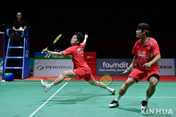 [쿠알라룸푸르=신화/뉴시스] 진용(왼쪽)-나성승 조가 26일(현지시각) 말레이시아 쿠알라룸푸르의 악시아타 아레나에서 열린 2024 말레이시아 마스터스 배드민턴선수권(월드투어 슈퍼 500) 남자복식 결승에서 킴 아스트룹-엔더스 스카룹 라스무센 조(덴마크)와 경기하고 있다. 나성승-진용이 0-2(18-21 14-21)로 패해 준우승을 차지했다. 2024.05.27.