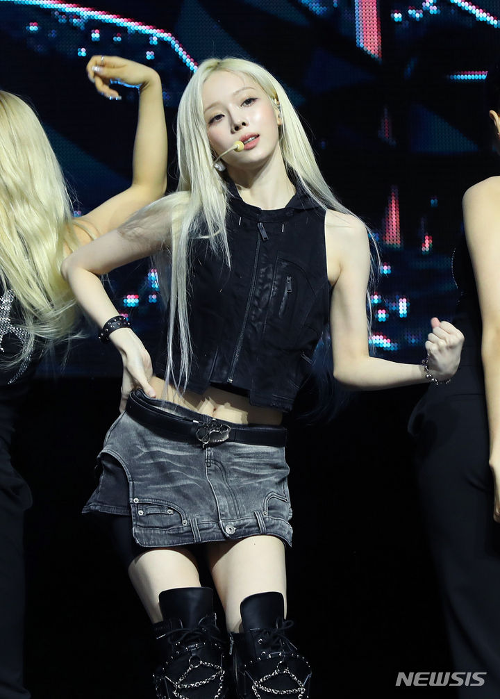 [서울=뉴시스] 김혜진 기자 = 그룹 에스파 윈터가 27일 오후 서울 용산구 한남동 블루스퀘어에서 열린 첫 정규 앨범 '아마겟돈(Armageddon)' 발매 기념 쇼케이스에서 무대를 선보이고 있다.