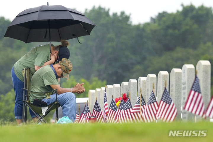 [휴스턴=AP/뉴시스] 메모리얼 데이인 27일(현지시각) 미 텍사스주 휴스턴 국립묘지를 찾은 한 부부가 해병대였던 아들의 묘 앞에 앉아 아들을 그리워하고 있다. 미국은 매년 5월 마지막 주 월요일에 현충일인 메모리얼 데이를 기념한다. 2024.05.28.