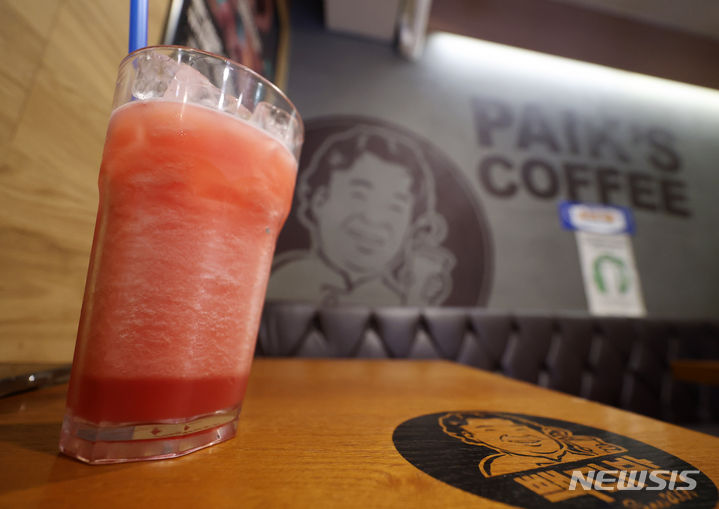 [서울=뉴시스] 김명년 기자 = 프랜차이즈 업계에 따르면 백종원 대표가 운영하는 더본코리아는 카페 프랜차이즈 빽다방의 이달 시즌 메뉴로 출시된 수박주스 가격을 전년 대비 5.2% 올렸다. 지난해 3800원이었던 동일 용량의 수박주스 메뉴가격이 올해 4000원으로 인상된 것이다. 경쟁 브랜드인 메가커피와 이디야의 수박주스 가격이 4000원, 4900원으로 동결된 것과 대조적이다. 사진은 28일 오후 서울시내 한 빽다방에서 판매중인 수박주스. 2024.05.28. [email protected]