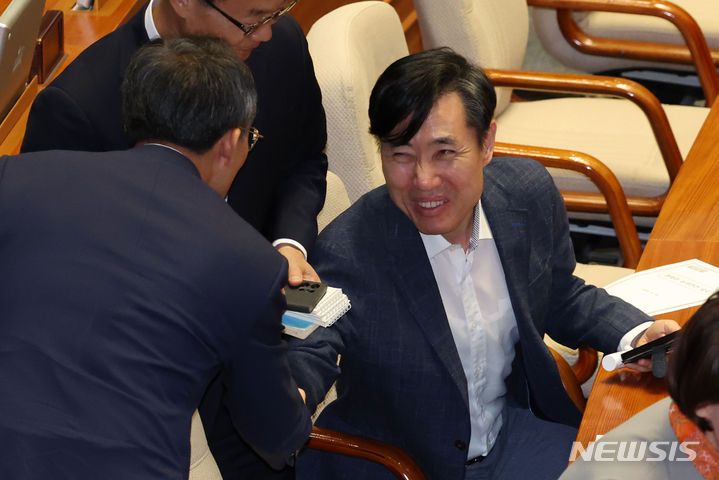 [서울=뉴시스] 조성우 기자 = 추경호(왼쪽) 국민의힘 원내대표가 28일 오후 서울 여의도 국회에서 열린 제414회 국회(임시회) 제2차 본회의에서 하태경 의원과 인사하고 있다. 2024.05.28. [email protected]