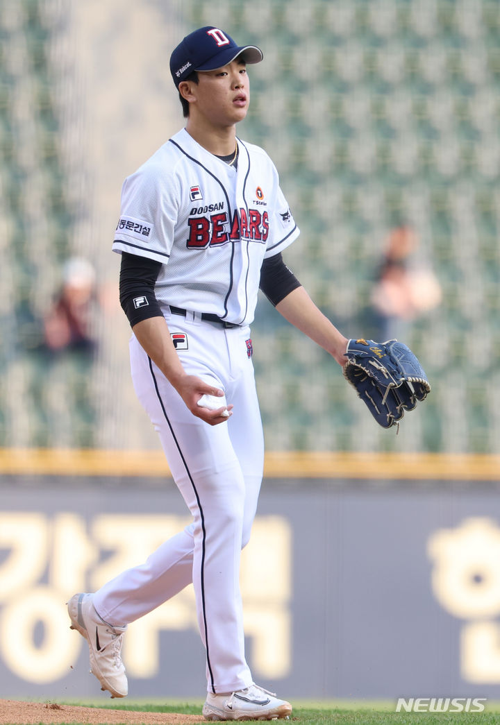 [서울=뉴시스] 이영환 기자 = 29일 오후 서울 송파구 잠실야구장에서 열린 2024 프로야구 KT 위즈와 두산 베어스의 경기, 1회초 두산 선발 최준호가 수비를 마친 후 덕아웃으로 향하고 있다. 2024.05.29. [email protected]