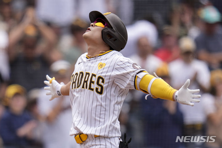 [샌디에이고=AP/뉴시스] 샌디에이고 파드리스의 김하성이 29일(현지시각) 미 캘리포니아주 샌디에이고의 펫코 파크에서 열린 2024 메이저리그(MLB) 마이애미 말린스와의 경기 3회 말 1점 홈런(7호)을 친 후 세리머니하며 홈인하고 있다. 2024.05.30.