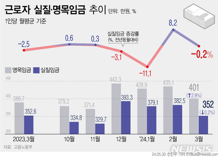 [서울=뉴시스] 30일 고용노동부에 따르면 3월 실질임금은 352만원으로 전년 동월 대비 0.2%(7000원) 감소했다. 지난 2월에는 상여금 효과로 인해 8.2% 반짝 올랐는데, 다시 빠진 것이다. 물가수준을 반영하지 않은 3월 상용근로자 1인 이상 사업체의 근로자 1인당 명목임금은 401만원이었다. (그래픽=전진우 기자)