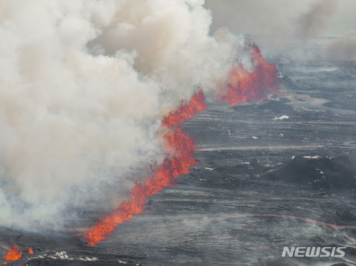 [그린다비크=AP/뉴시스] 29일(현지시각) 아이슬란드 레이캬네스 반도 그린다비크의 화산이 폭발해 용암과 연기가 분출되고 있다. 아이슬란드 당국은 용암이 약 50m 높이까지 분출했으며 인근 주민과 관광객들을 대피시켰다고 밝혔다. 2024.05.30.