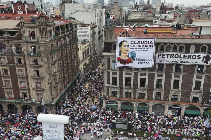 [멕시코시티=AP/뉴시스] 멕시코 대선 유세 마지막 날인 29일(현지시각) 수도 멕시코시티의 소칼로 광장에서 열린 클라우디아 셰인바움 대선 후보의 유세 현장에 지지자들이 모여들고 있다. 멕시코 좌파 집권당 국가재생운동당(모레나)의 셰인바움 후보는 오는 6월 2일 치러질 대선 투표에서 멕시코 최초의 여성 대통령 당선이 유력시된다. 2024.05.30.