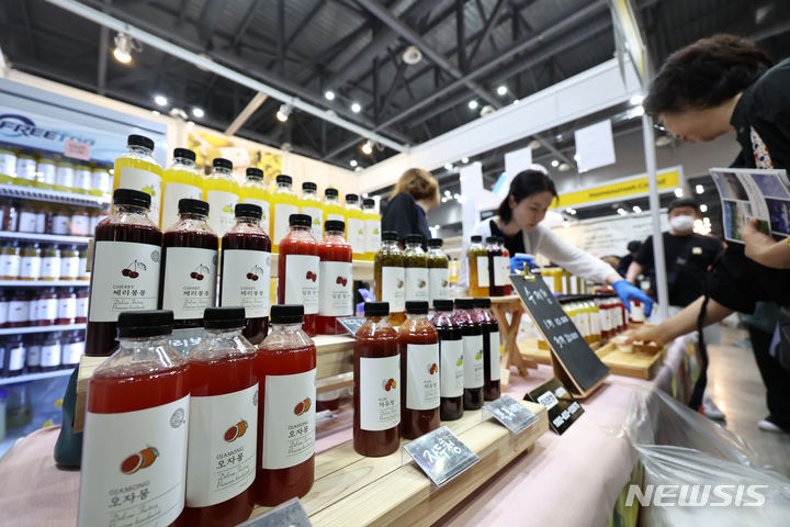 [고양=뉴시스] 김금보 기자 = 30일 경기도 고양시 킨텍스에서 열린 '메가쇼 2024 시즌 1' 박람회를 찾은 관람객들이 수제청을 맛보고 있다. 2024.05.30. [email protected]