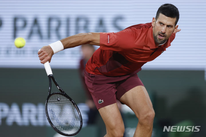 [파리=AP/뉴시스] 노바크 조코비치(1위·세르비아)가 1일(현지시각) 프랑스 파리 롤랑가로스경기장에서 열린 프랑스 오픈 남자 단식 3라운드에서 로렌초 무세티(30위·이탈리아)와 경기하고 있다. 이 대회 2연패를 노리는 조코비치가 약 4시간 30분에 걸친 풀세트 접전 끝에 3-2(7-5 6-7 2-6 6-3 6-0)로 승리하고 16강에 올랐다. 2024.06.02.