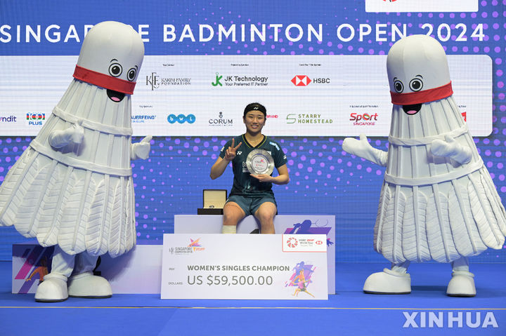 [싱가포르=신화/뉴시스] 안세영(1위)이 2일(현지시각) 세계배드민턴연맹(BWF) 월드투어 슈퍼 750 싱가포르오픈 여자 단식 우승 정상에 올라 트로프릴 들고 기념 촬영을 하고 있다. 안세영은 결승전에서 천위페이(2위·중국)를 2-1(21-19 16-21 21-12)로 꺾고 우승했다. 2024.06.03.