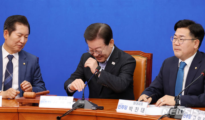 [서울=뉴시스] 조성우 기자 = 이재명(가운데) 더불어민주당 대표가 3일 오전 서울 여의도 국회에서 열린 최고위원회의에서 서영교 최고위원의 조세재정연구원 관련 발언을 듣다 미소짓고 있다. 2024.06.03. [email protected]