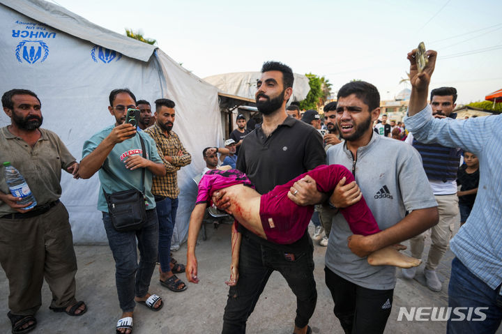 [가자지구=AP/뉴시스] 4일(현지시각) 이스라엘의 가자지구 중부 부레이 난민촌 주거용 건물 폭격으로 다친 팔레스타인 어린이가 데이르 알발라에 있는 알아크사 병원으로 이송되고 있다. 2024.06.05.