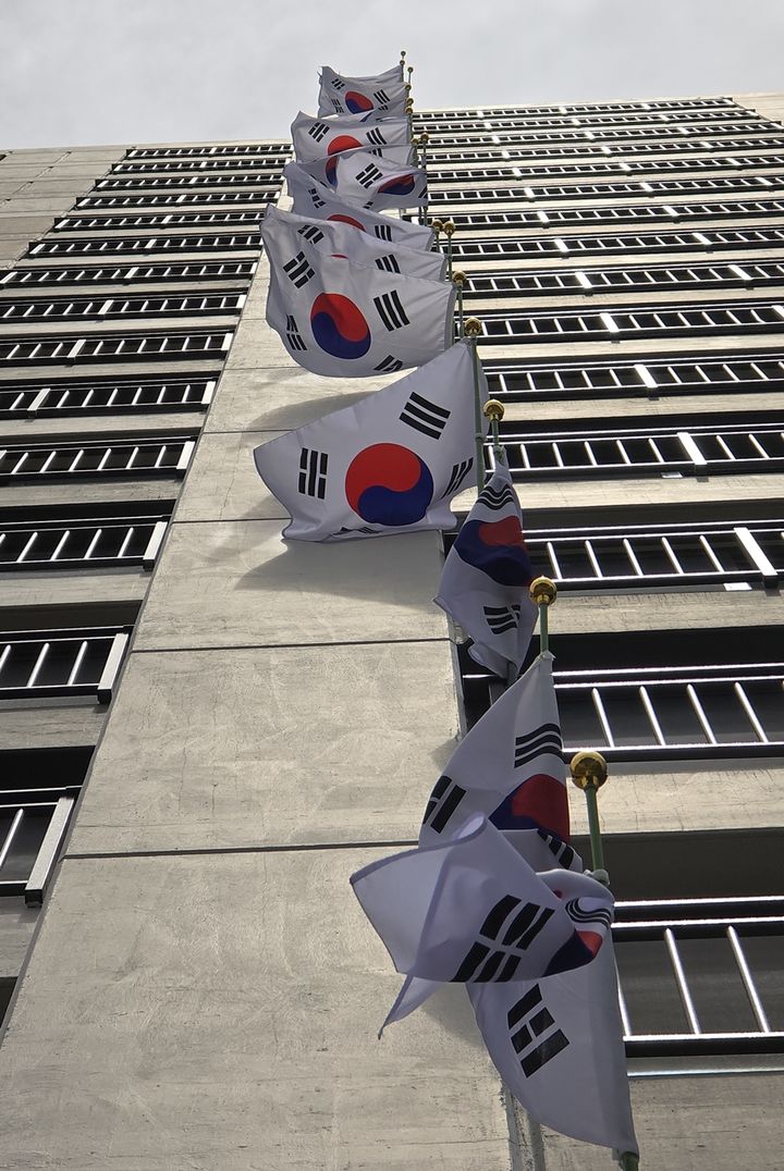 [대구=뉴시스] 현충일인 6일 대구 서대구역반도유보라센텀 아파트 1400여 세대가 태극기를 게양해 나라사랑 정신을 되새기고 있다. (사진=독자 제공) 2024.06.06. [email protected]