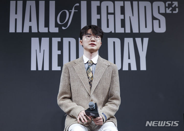 [서울=뉴시스] 정병혁 기자 = e스포츠 사상 최초로 만들어진 '전설의 전당'의 초대 헌액자로 선정된 '페이커' 이상혁이 6일 서울 중구 신라호텔에서 열린 리그오브레전드 전설의 전당 미디어데이 기자회견에서 질문을 듣고 있다. 2024.06.07. [email protected]