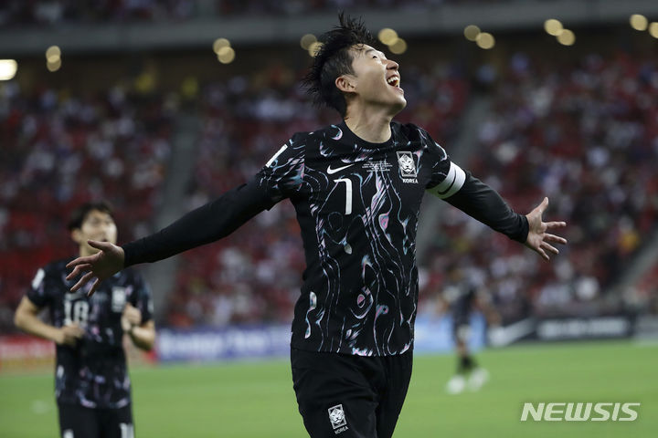 [싱가포르=AP/뉴시스] 6일(현지시각) 싱가포르 더 내셔널 스타디움에서 열린 2026 북중미 월드컵 아시아 2차 예선 조별리그 C조 5차전 대한민국 대 싱가포르의 경기, 손흥민이 골을 넣은 뒤 기뻐하고 있다. 2024.06.06.