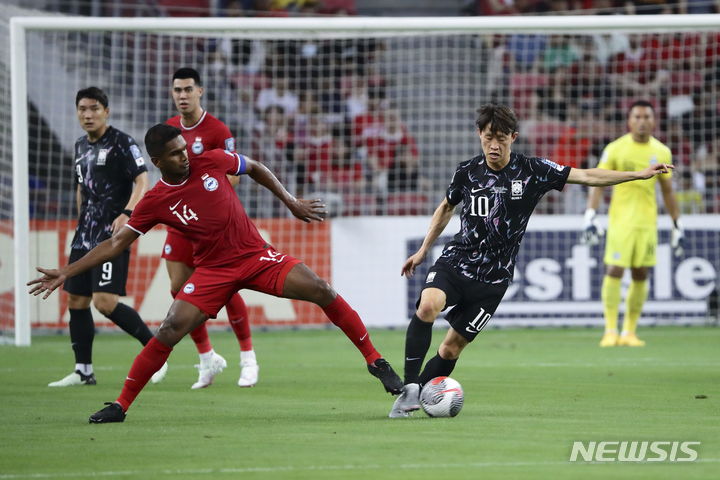 [싱가포르=AP/뉴시스] 6일(현지시각) 싱가포르 더 내셔널 스타디움에서 열린 2026 북중미 월드컵 아시아 2차 예선 조별리그 C조 5차전 대한민국 대 싱가포르의 경기, 이재성이 수비를 하고 있다. 2024.06.06.