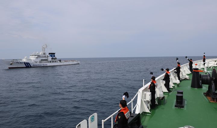 [서울=뉴시스] 해양경찰청은 한·미·일 수색구조 협력체계 강화를 위해 지난 3일부터 6일까지 일본 마이즈루항 인근 해상에서 연합훈련을 실시했다. 해경 3016함과 일본 해상보안청 PL93함이 훈련에 앞서 대함경례를 하고 있다. (사진=해양경찰청 제공) 2024.06.07. [email protected] *재판매 및 DB 금지