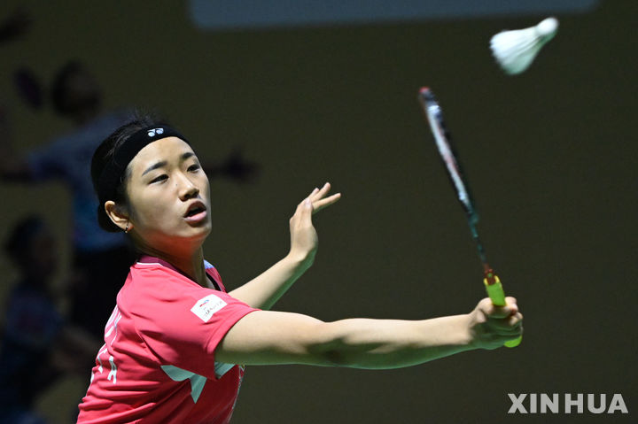 [자카르타=신화/뉴시스] 안세영(1위)이 7일(현지시각) 인도네시아 자카르타에서 열린 세계배드민턴연맹(BWF) 월드투어 슈퍼 1000 인도네시아오픈 여자 단식 8강전에서 허빙자오(8위·중국)와 경기하고 있다. 안세영이 2-0(21-17 21-14)으로 이기고 4강에 올라 왕즈이(6위·중국)와 결승 진출을 다툰다. 2024.06.08.