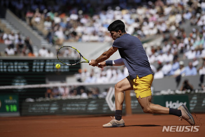 [파리=AP/뉴시스] 카를로스 알카라스(3위·스페인)가 7일(현지시각) 프랑스 파리 롤랑가로스 경기장에서 열린 프랑스 오픈 남자 단식 준결승에서 얀니크 신네르(2위·이탈리아)와 경기하고 있다. 알카라스가 4시간 9분의 풀세트 접전 끝에 3-2(2-6 6-3 3-6 6-4 6-3)로 이기고 결승에 올라 알렉산더 츠베레프(4위·독일)와 패권을 다툰다. 2024.06.08.