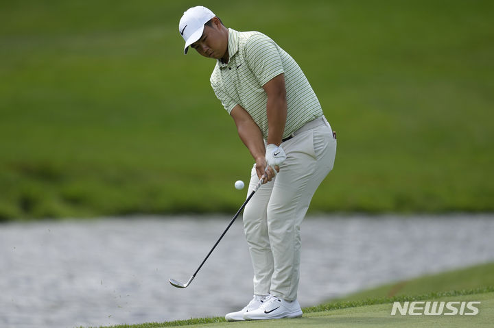 [더블린=AP/뉴시스] 김주형이 7일(현지시각) 미 오하이오주 더블린의 뮤어필드 빌리지 GC에서 열린 미국프로골프(PGA) 투어 메모리얼 토너먼트 2라운드 14번 그린에서 샷하고 있다. 김주형은 중간 합계 이븐파 145타 공동 29위에 이름을 올렸다. 2024.06.08.