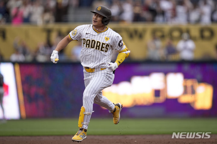 [샌디에이고=AP/뉴시스] 샌디에이고 파드리스의 김하성이 8일(현지시각) 미 캘리포니아주 샌디에이고의 펫코 파크에서 열린 2024 메이저리그(MLB) 애리조나 다이아몬드백스와의 경기 2회 말 3점 홈런(시즌 9호)을 친 후 베이스를 돌고 있다. 2024.06.09.