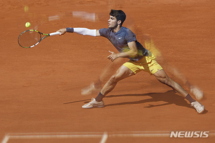 [파리=AP/뉴시스] 카를로스 알카라스(3위·스페인)가 9일(현지시각) 프랑스 파리 롤랑가로스 경기장에서 열린 프랑스 오픈 남자 단식 결승에서 알렉산더 츠베레프(4위·독일)와 경기하고 있다. 알카라스는 츠베레프를 4시간 19분의 풀세트 접전 끝에 3-2(6-3 2-6 5-7 6-1 6-2)로 꺾고 이 대회 첫 우승을 차지했다. 2024.06.10.