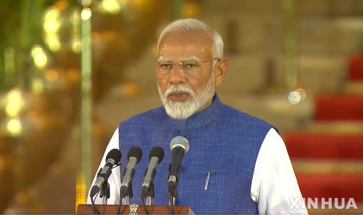 [뉴델리=신화/뉴시스] 나렌드라 모디 인도 총리가 9일(현지시각) 뉴델리의 대통령궁에서 취임식을 하고 있다. 세 번째 임기를 시작한 모디 총리는 14억 인도 인구의 80%를 차지하는 힌두교도의 대변자로 여겨지고 있다. 2024.06.10.