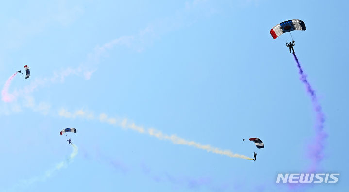 [평택=뉴시스] 김종택 기자 = 한미동맹 71주년을 맞아 10일 경기도 평택시 캠프 험프리스에서 열린 '카투사 친선 주간 개회식 행사'에서 제707특수임무단 대원들이 고공낙하 시범을 펼치고 있다. 2024.06.10. [email protected]