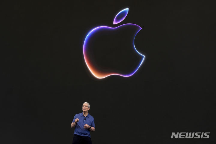 [쿠퍼티노=AP/뉴시스] 팀 쿡 애플 최고경영자(CEO)가 10일(현지시각) 캘리포니아 쿠퍼티노 애플 캠퍼스에서 열린 세계개발자회의(WWDC) 2024에서 새 제품을 발표하고 있다. 2024.06.11.