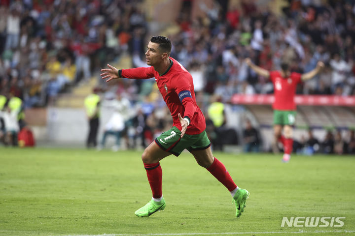 [아베이루=AP/뉴시스] 포르투갈의 크리스티아누 호날두가 11일(현지시각) 포르투갈 아베이루의 아베이루 시립 경기장에서 열린 아일랜드와의 평가전 중 득점 후 환호하고 있다. 호날두는 멀티 골을 기록해 A매치 통산 최다 득점 기록(130호)을 새로 쓰며 포르투갈의 3-0 승리를 이끌었다. 2024.06.12.