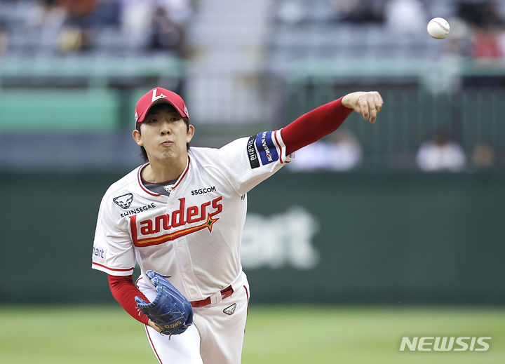 [인천=뉴시스] 정병혁 기자 = 12일 인천 미추홀구 SSG랜더스필드에서 열린 2024 KBO리그 KIA 타이거즈와 SSG 랜더스의 경기, SSG 선발 오원석이 역투하고 있다. 2024.06.12. [email protected]