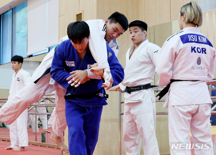 [진천=뉴시스] 김진아 기자 = 13일 충북 진천국가대표선수촌에서 열린 2024 파리 하계올림픽 유도 대표팀 미디어데이 행사에서 안창림 코치가 선수들을 지도하고 있다. 2024.06.13. [email protected]