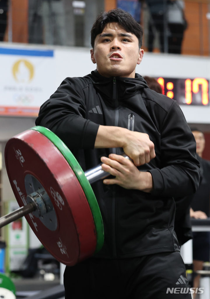 [진천=뉴시스] 김진아 기자 = 13일 충북 진천국가대표선수촌에서 열린 2024 파리 하계올림픽 유도 대표팀 미디어데이 행사에서 김원진이 웨이트 트레이닝을 하고 있다. 2024.06.13. [email protected]