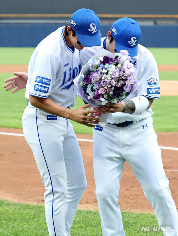 [대구=뉴시스] 이무열 기자 = 13일 대구 수성구 삼성라이온즈파크에서 열린 2024 신한 SOL 뱅크 KBO리그 LG 트윈스와 삼성 라이온즈의 경기, 삼성 박병호가 한미 400홈런을 달성한 뒤 팀 주장 구자욱에게 꽃다발을 받고 있다. 2024.06.13. [email protected]