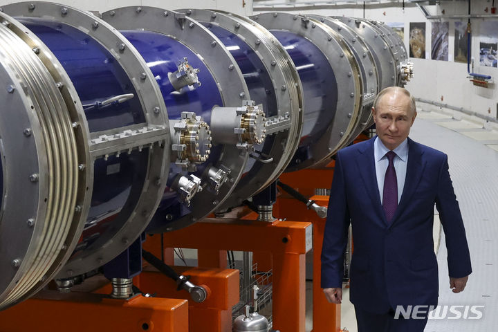 [두브나=AP/뉴시스] 블라디미르 푸틴 러시아 대통령이 13일(현지시각) 러시아 모스크바 북쪽 116㎞ 떨어진 두브나의 핵 공동연구소를 방문해 NICA 이온 입자 가속기를 둘러보고 있다. 2024.06.14.