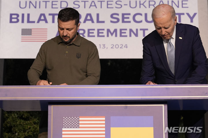 [사벨레트리=AP/뉴시스] 조 바이든(오른쪽) 미국 대통령과 볼로디미르 젤렌스키 우크라이나 대통령이 13일(현지시각) 이탈리아 사벨레트리에서 안보 협정에 서명하고 있다. 미국이 우크라이나 방위력 증강을 위해 10년간 무기와 훈련 등을 지원하는 안보 협정을 체결해 향후 10년간 우크라이나 방위력 향상을 위한 지원에 나선다. 2024.06.14.