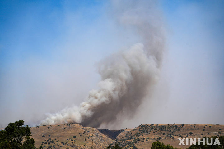 [골란고원=신화/뉴시스] 13일(현지시각) 레바논의 로켓 공격을 받은 이스라엘 골란고원에서 연기가 치솟고 있다. 이스라엘군은 레바논 북부에서 약 45발의 발사체가 발사됐다고 밝혔다. 2024.06.14.