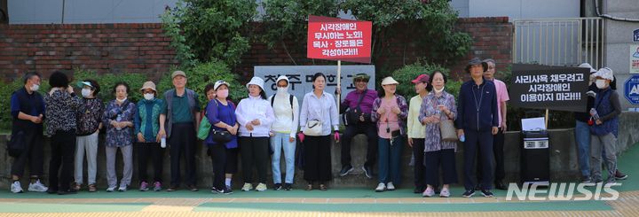 [청주=뉴시스] 서주영 기자 = 청주맹학교 총동문회가 14일 학교 앞에서 집회를 열고 충북광화원에 시각장애인 산하기관장 선임을 촉구하고 있다. 2024.06.14. [email protected]