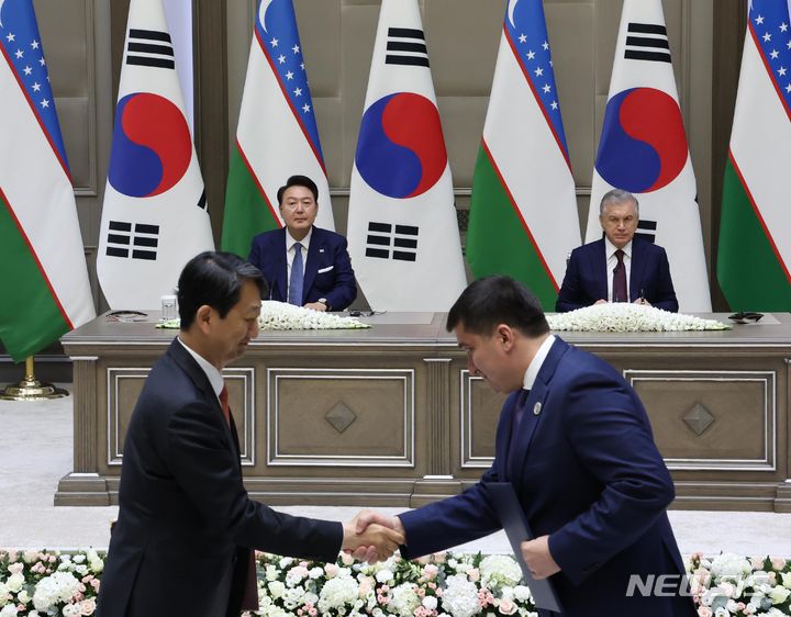 [타슈켄트(우즈베키스탄)=뉴시스] 조수정 기자 = 우즈베키스탄을 국빈 방문한 윤석열 대통령과 샤브카트 미르지요예프 우즈베키스탄 대통령이 임석한가운데 14일(현지시간) 타슈켄트 우즈베키스탄 대통령궁 영빈관에서 안덕근 대한민국 산업통상자원부장관과 아지즈벡 우루노프 우즈베키스탄 WTO협상특별대표가 우즈베키스탄 WTO 가입을 위한 양자협상 의정서 서명식을 하고 있다. 2024.06.14. [email protected]