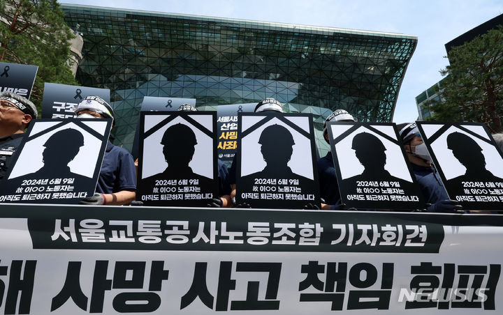 [서울=뉴시스] 김명년 기자 = 서울교통공사노동조합 조합원들이 17일 오전 서울 중구 시청 앞에서 '산재 사망 책임 회피 규탄! 서울시·공사의 사과, 재발 방지 촉구!' 기자회견을 열고 있다.